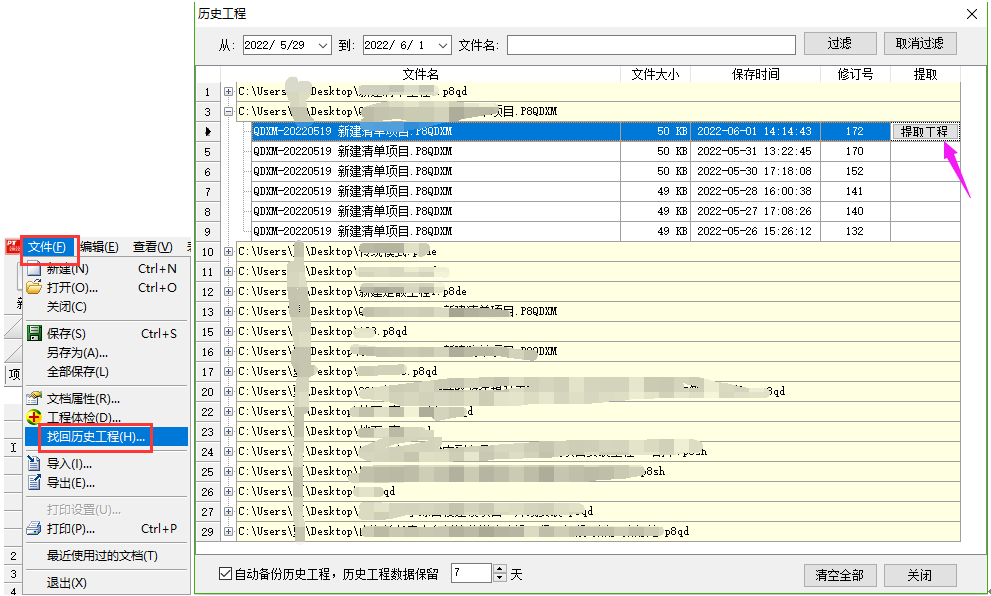 答:軟件提供找回歷史工程的功能,默認(rèn)是保留七天以內(nèi)的工程數(shù)據(jù)的。 點(diǎn)擊菜單欄文件下的找回歷史工程,在彈出的窗口找到對(duì)應(yīng)工程點(diǎn)開加號(hào),對(duì)照保存時(shí)間列找到相應(yīng)時(shí)間點(diǎn)的工程,提取工程數(shù)據(jù)即可。如下所示: