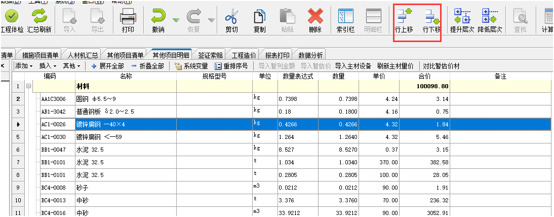 答:人材機(jī)界面勾選主要材料標(biāo)志后,切換到其他項(xiàng)目明細(xì)界面,點(diǎn)擊導(dǎo)入主材設(shè)備,在這個(gè)界面可以上下行移動(dòng)排序。