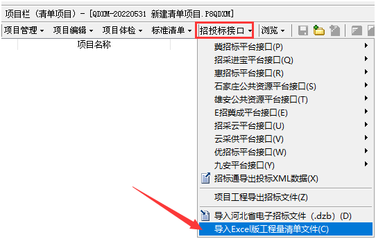 答:在建好的項(xiàng)目工程中,點(diǎn)擊招投標(biāo)接口中的“導(dǎo)入Excel版工程量清單文件”按鈕,如下圖所示: