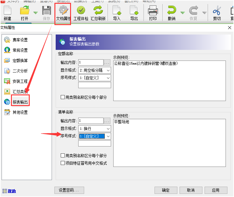 答:本身清單項(xiàng)目特征序號(hào)自動(dòng)有默認(rèn)排序,導(dǎo)入Excel版工程量清單之后項(xiàng)目特征序號(hào)出現(xiàn)了重復(fù)。 按照以下截圖,通過文檔屬性窗口的報(bào)表輸出功能,把序號(hào)樣式改成自定義即可。