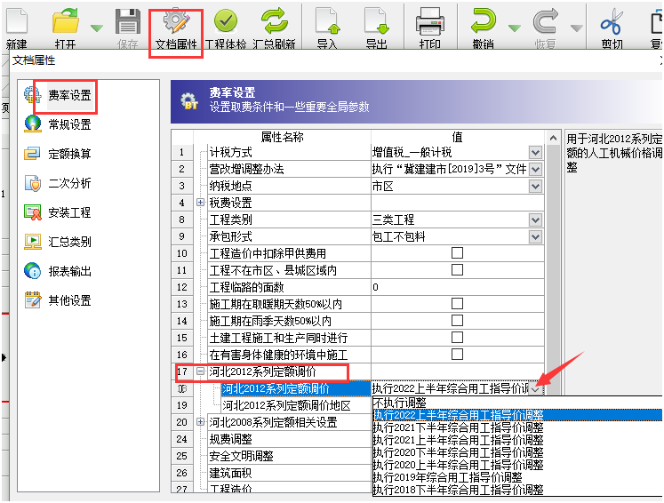 答:各地市出文件的時(shí)間不一致,大家使用的時(shí)候一定要更新到最新版本軟件程序。 更新到最新版本之后,點(diǎn)擊文檔屬性窗口,在默認(rèn)的第一個(gè)費(fèi)率設(shè)置界面可以切換選擇對(duì)應(yīng)時(shí)間對(duì)應(yīng)地市的人工指導(dǎo)價(jià)文件。如下截圖: