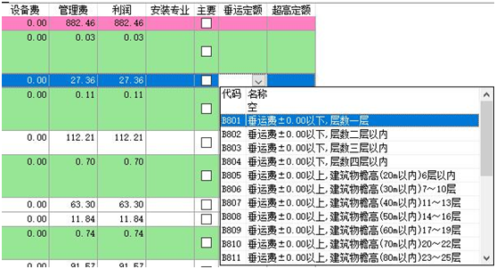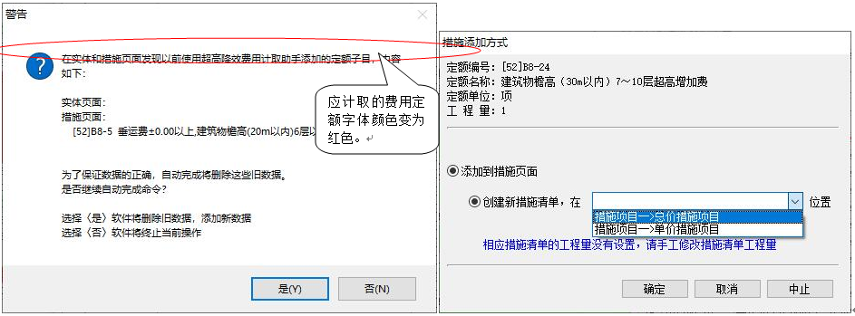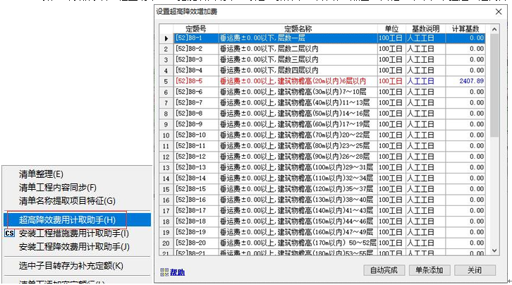 3)、執(zhí)行該命令,彈出如下窗口,應(yīng)計(jì)取的超高及垂運(yùn)費(fèi)用定額將變成紅色,其計(jì)取基數(shù)變成藍(lán)色。 4)、直接雙擊紅色定額行 或 點(diǎn)擊“單條添加”按鈕,可實(shí)現(xiàn)單條添加該項(xiàng)費(fèi)用定額到當(dāng)前選擇的位置。點(diǎn)擊“自動(dòng)完成”按鈕,將自動(dòng)添加當(dāng)前工程所有的“垂運(yùn)費(fèi)”和“超高費(fèi)”定額,點(diǎn)擊“自動(dòng)完成”按鈕后,點(diǎn)擊自動(dòng)完成,系統(tǒng)自動(dòng)檢測工程中是否已經(jīng)存在相關(guān)費(fèi)用定額。如已經(jīng)計(jì)取了相關(guān)費(fèi)用,會(huì)進(jìn)行提示。