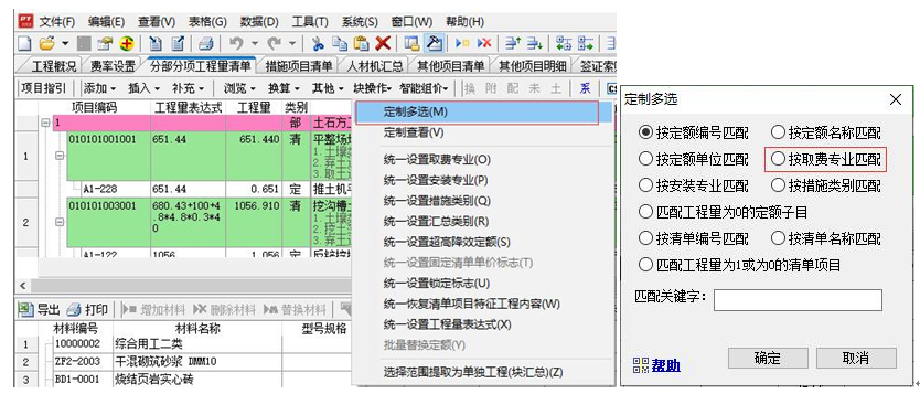 2)、選擇多條定額子目,統(tǒng)一設(shè)置“超高垂運(yùn)”標(biāo)志 (1)手動(dòng)按“Ctrl+左健”可選擇多條定額子目; (2)在“分部分項(xiàng)工程量清單”或者“預(yù)算表”界面,點(diǎn)擊“塊操作”下拉選擇“定制多選”,按取費(fèi)專業(yè)選擇裝飾裝修專業(yè)點(diǎn)擊確定(這個(gè)選擇方法會(huì)一次把裝飾定額全部選擇中)。
