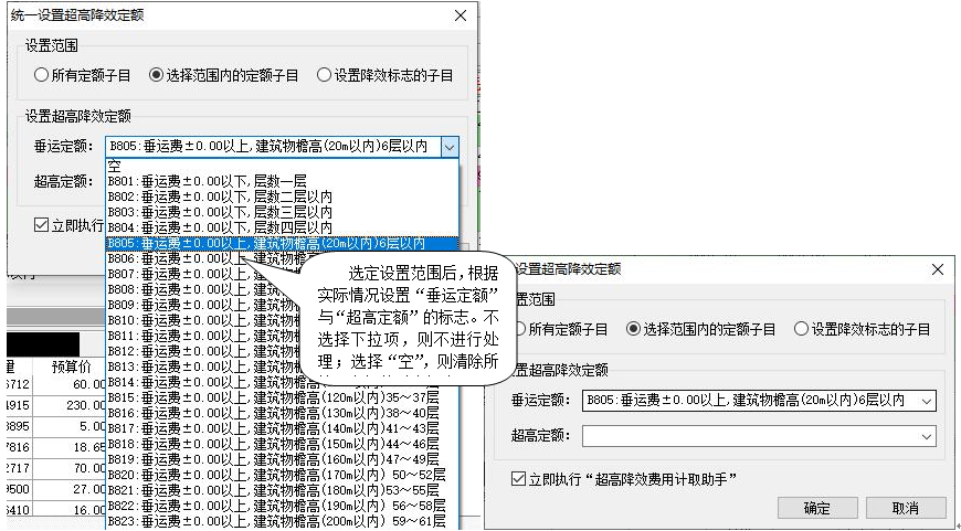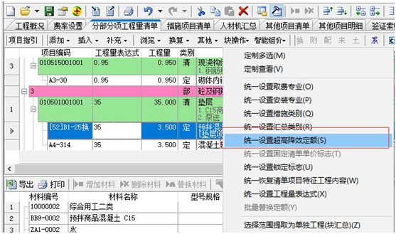 (3)通過“塊操作”下的“統(tǒng)一設(shè)置超高降效定額”功能,可對(duì)選中的定額進(jìn)行統(tǒng)一設(shè)置超高降效標(biāo)志。如下圖所示: