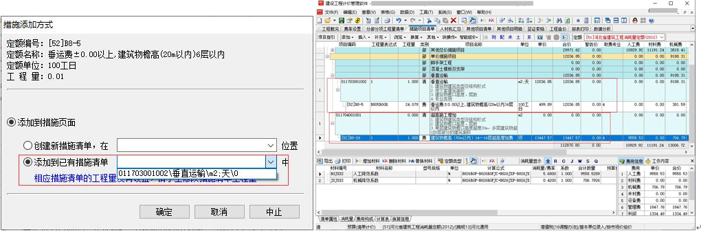 6)、點(diǎn)擊“確定”按鈕,由于當(dāng)前工程為清單工程,系統(tǒng)自動(dòng)將費(fèi)用定額添加到措施頁面中對(duì)應(yīng)措施項(xiàng)目下,如下圖: