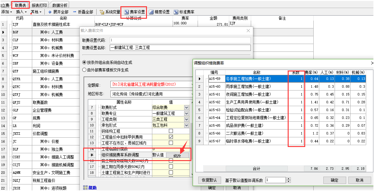 定額工程中,在取費(fèi)表界面,點(diǎn)擊費(fèi)率設(shè)置按鈕,可以通過修改組織措施費(fèi)系數(shù)來實(shí)現(xiàn)。如下截圖: