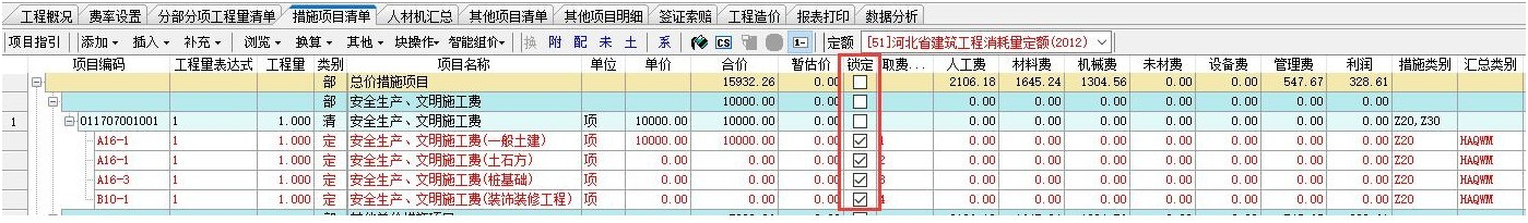 如果不希望文檔屬性或者費(fèi)率重置的時(shí)候會(huì)將固定好的安全文明施工費(fèi)再重置,則需要將所有的分專業(yè)的安全文明施工費(fèi)的定額行都固定。如下截圖: