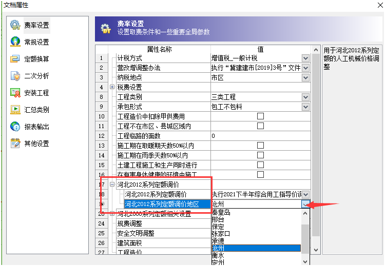 答:各地市出文件的時(shí)間不一致,大家使用的時(shí)候一定要更新到最新版本軟件程序。 更新到最新版本之后,點(diǎn)擊文檔屬性窗口,在默認(rèn)的第一個(gè)費(fèi)率設(shè)置界面可以切換選擇對(duì)應(yīng)時(shí)間對(duì)應(yīng)地市的人工指導(dǎo)價(jià)文件。如下截圖: