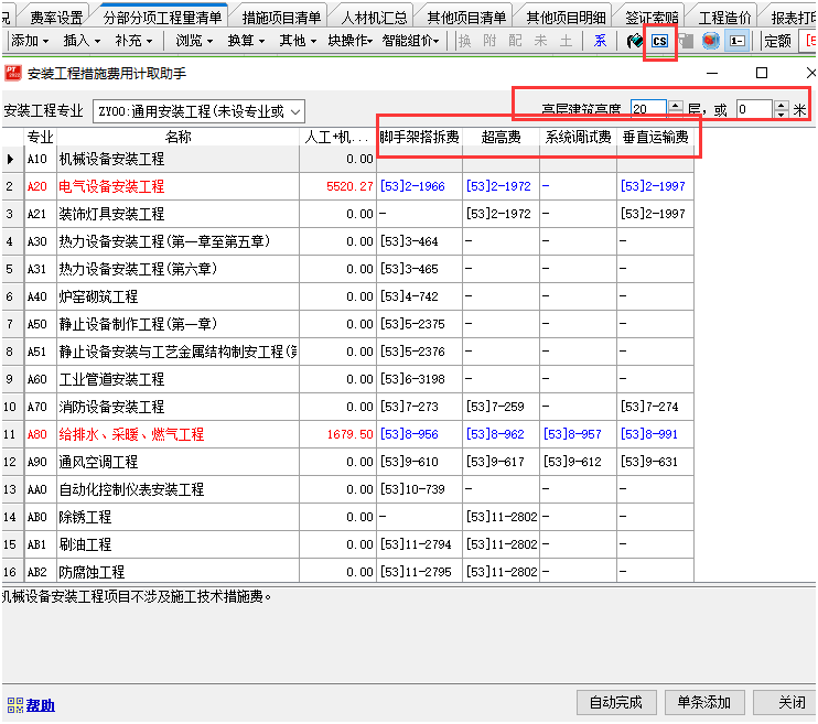 答:針對(duì)安裝專業(yè)的工程,咱們軟件提供了安裝工程措施費(fèi)用計(jì)取助手(也就是CS按鈕)的功能,一鍵計(jì)取安裝專業(yè)的超高費(fèi)、垂運(yùn)費(fèi)、腳手架搭拆費(fèi)和系統(tǒng)調(diào)試費(fèi)這四項(xiàng)費(fèi)用。 注意功能操作之前不需要特意選中定額子目,軟件會(huì)自動(dòng)識(shí)別到安裝定額庫各個(gè)分冊的子目,來自動(dòng)統(tǒng)計(jì)基數(shù),截圖如下: